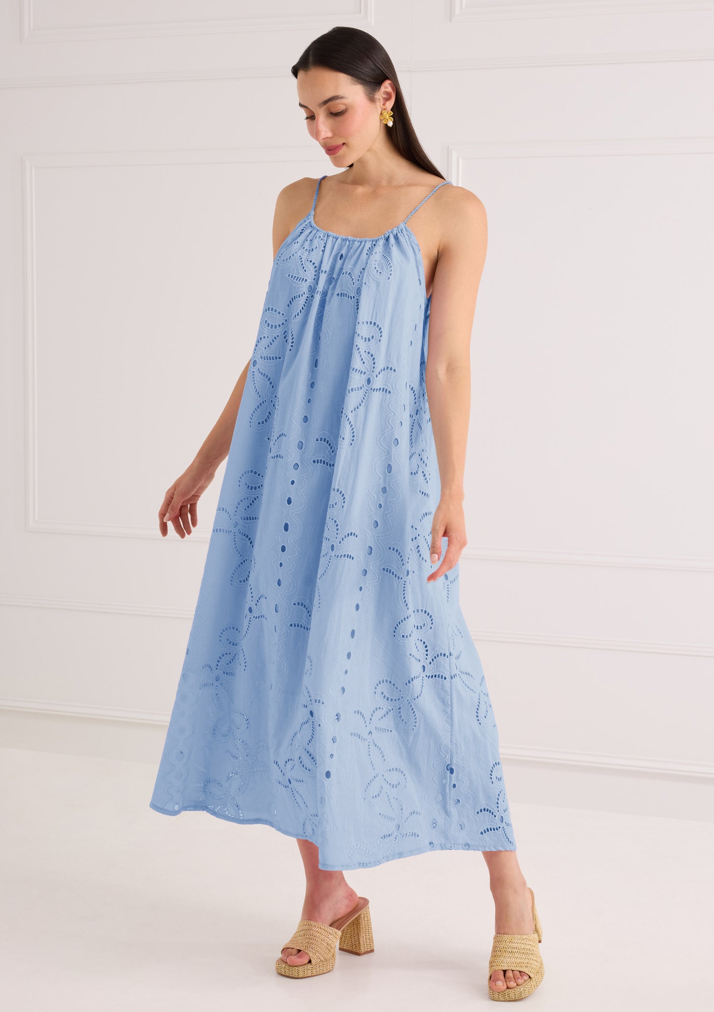 This breezy blue dress features delicate eyelet embroidery with a flowy, relaxed silhouette for an effortlessly elegant look. Perfect for warm days, vacations, and Spring soirees! Adjustable tie straps make for an easy fit. Fully lined.